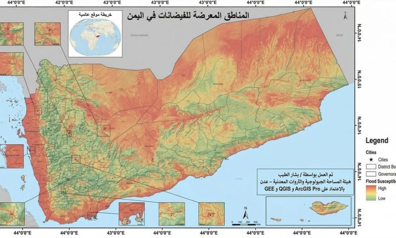في إطار جهودها العلمية لرصد المخاطر الطبيعية ودعم التخطيط وإدارة الكوارث، نشرت هيئة المساحة الجيولوجية والثروات المعدنية – عدن خريطة علمية توضح المناطق الأكثر عرضة للفيضانات في الجمهورية اليمنية، وذلك اعتمادًا على تقنيات نظم المعلومات الجغرافية (GIS) والتحليل المكاني باستخدام برامج ArcGIS Pro وQGIS ومنصة Google Earth Engine (GEE).